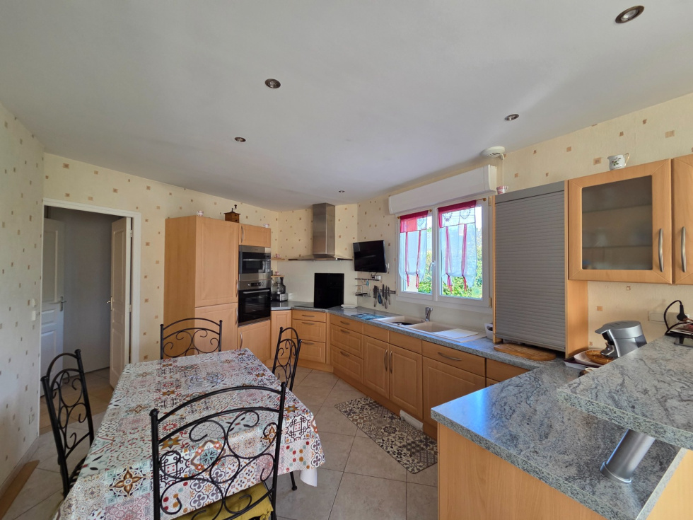LE MANS OUEST : Nous vous invitons à découvrir ce magnifique pavillon contemporain de 2007 en parfait état, offrant une vie totalement de plain-pied avec une très belle qualité de construction et des prestations irréprochables. Dès l'entrée, vous serez séduits par la vaste pièce de vie d’environ 45m² baignée de lumière grâce à de larges ouvertures qui donnent accès directement à l’extérieur. Pour votre plus grand confort, elle dispose également d'un poêle à bois de marque HASE. La cuisine ouverte, aménagée et équipée, s'intègre parfaitement à cet espace convivial avec son coin repas. Le coin nuit se compose d’une salle d'eau et d’une salle de bains indépendantes et de quatre chambres spacieuses, dont une suite avec dressing privatif. Vous profiterez d’un garage double d’environ 55m², d’un grand grenier de plus de 30m², d’une cave et d’une pièce aménagée en studio qui sera idéale pour recevoir vos invités. À l’extérieur, le charme continue d’opérer sur cette parcelle paysagée et clôturée sans aucun vis à vis. Vous bénéficierez d'un jardin arboré avec soin, de grandes terrasses, d’une pergola, d'une vaste serre, et d'un système de récupération des eaux de pluie.Côté energétique, ce pavillon affiche une excellente performance (DPE B) grâce à sa pompe à chaleur réversible et son plancher chauffant vous garantissant ainsi un confort tout au long de l’année. Située à proximité immédiate des écoles, des commerces et des transports, cette propriété vous offre le luxe de la tranquillité sans renoncer aux commodités urbaines. Alors n’hésitez plus à programmer une visite pour découvrir ce bien rare sur le marché ! Le cabinet JOUSSE-PEAN, agence immobilière sur LE MANS, adhérente FNAIM, vous propose cette maison de plain-pied avec 4 chambres, garage double, jardin, cave, grenier à proximité du centre-ville de LE MANS. Réf. 8975